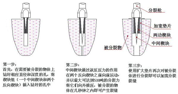 其具體實施步驟如下:首先,在被分裂的物體上鉆一個特定直徑和深度的孔,將分裂機的楔塊組(一個中間楔塊和兩個反向楔塊)插入孔中,中間楔塊通過液壓壓力的作用在兩個反向楔塊之間向前運動,由內向外釋放出極大的能量,將被分裂的物體